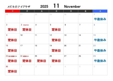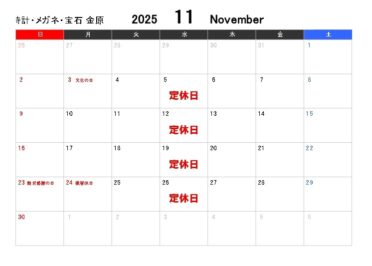 時計・メガネ・宝石 金原とメガネのアイプラザの2025年11月定休日のお知らせです。