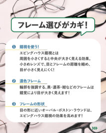 ①錯視を使う エビングハウス錯視とは 周囲を小さくすると 中央が大きく見える効果。 小さ目レンズで、 目とフレームの距離を縮め、 目が小さく見えにくく! ②濃色フレーム 輪郭を強調する黒・濃茶・紺などの メガネフレームは 錯覚により目が大きく見えます! ③メガネフレームの形状 目の形に近いオーバル・ボストン・ ラウンドのフレーム形状は、 エビングハウス錯視の効果を 高めます。 お客様のメガネのお悩みは豊橋市の時計・メガネ・宝石 金原と田原市のメガネのアイプラザにぜひご相談ください!   小さ見えを上手に抑えるおすすめ眼鏡フレームはこんな感じです!