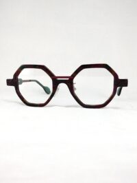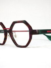 多角形のフォルムとパープル・グリーン・ブラウンのセル生地をマーブルに混ぜた色遣いが品のあるメガネです。