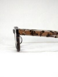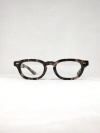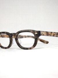 厚セル上下薄めのスクエア型で黒味気味のライトブラウン地に雲が流れるようなダークグレーのマーブル柄、ゴールドのメタルポイントも相変わらず渋いデザインです。