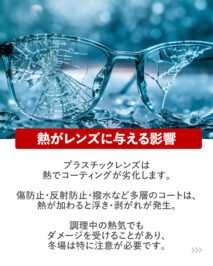 プラスチックレンズは熱でコーティングが劣化します。