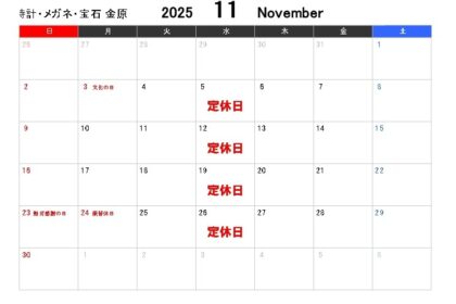 いつもご来店ありがとうございます。 時計・メガネ・宝石 金原とメガネのアイプラザの2025年11月定休 …続きを読む >